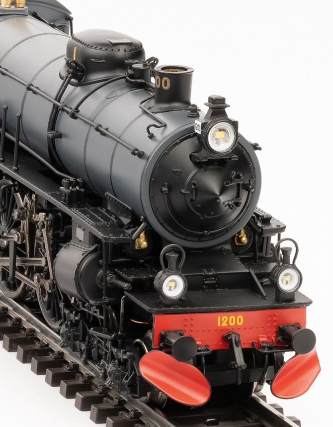 Ein eleganter Anblick. Der graue Kessel und die roten Schienenräumer mit roten Pufferbohle.